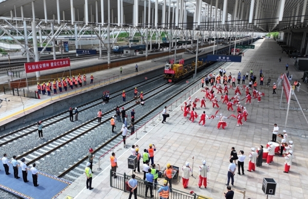 7月1日在延安站拍摄的西延高铁轨道贯通仪式(无人机照片)。