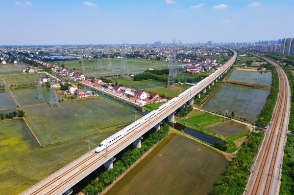 7月1日,列车在江苏省南通市通州区境内行驶(无人机照片)。