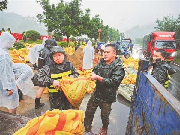 6月24日,榕江县党员干部群众搬运沙袋防汛抢险。 潘邵平 摄