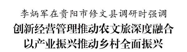 6月30日,省委副书记、省长李炳军到贵阳市修文县调研巩固拓展脱贫攻坚成果同乡村振兴有效衔接工作。他强调,要深入学习贯彻习近平总书记关于“三农”工作的重要论述和在贵州考察时的重要讲话精神,进一步创新经营管理模式,推动农文旅融合发展,更好带动群众稳定增收,以产业振兴推动乡村全面振兴。省领导胡忠雄、杨同光参加。