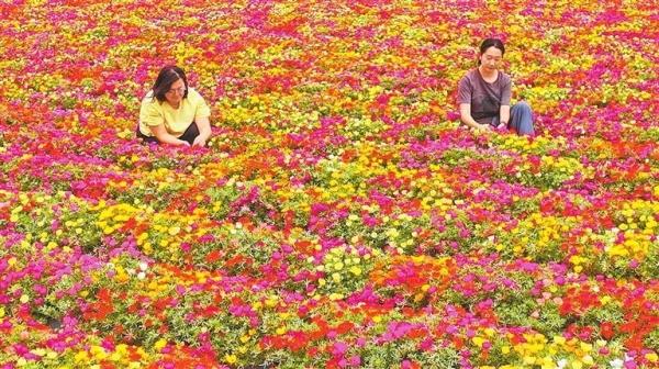 近日,在高台县合黎镇松叶牡丹制种基地,花农为盛开的鲜花授粉。(通讯员王将)
