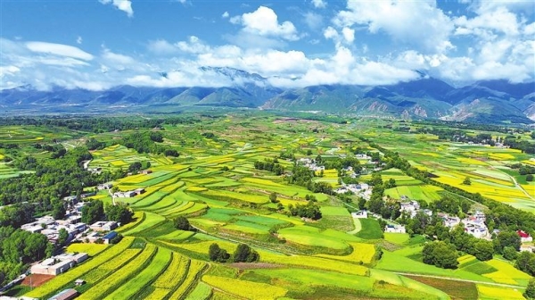 积石山县8万亩油菜花进入盛花期,绽放的油菜花与蓝天白云相互映衬,构成一幅美丽的田园画卷。(记者田蹊)